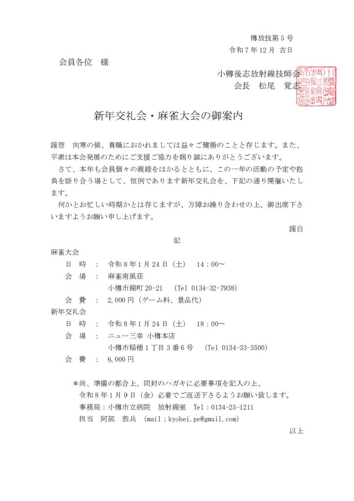 2026.1.24(土)小樽技師会 新年交礼会・麻雀大会のご...